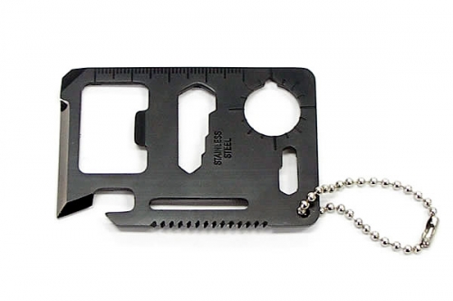 Misc Survival Card. Measures 2 3/4" x 1 3/4". Black finish stainless construction. May be used as a can opener, knife edge, screwdriver, ruler, cap lifter, wrench, butterfly wrench and saw blade. Lanyard hole. Keychain. Black plastic storage sleeve.