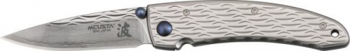 Mcusta Nami Small. 3 1/2" closed framelock. 2 5/8" VG-10 Damascus steel blade with dual thumb studs. Stainless handles with decorative styling. Lanyard hole. Stainless pocket clip.