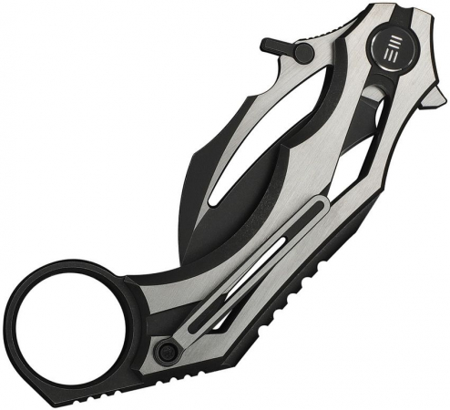 4.63" (11.76cm) closed. 2" (5.08cm) black stonewash and satin finish Bohler M390 stainless hawkbill blade. Black and satin titanium handle. Extended tang. Finger ring. Thumb disk. Pocket clip. Black nylon zippered storage case. Boxed.