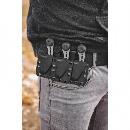 4.25" overall. 2" tumbled finish 1095HC steel blade. Black canvas micarta handle. One-piece construction. Contains one each: Hunter's Point, sheepsfoot, and tanto blades. Belt sheath holds all three knives. Black Kydex belt sheath. Bulk packed.