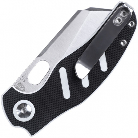 3.5" (8.89cm) closed. 2.63" (6.68cm) satin finish 154CM stainless blade. Black and white G10 handle. Thumb pull. Extended tang. Pocket clip. Boxed.