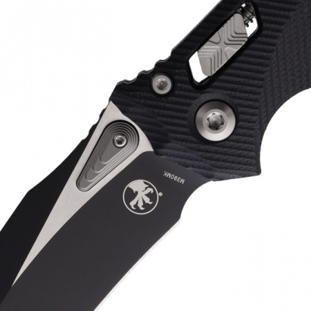 5.38" (13.67cm) closed. 4" (10.16cm) two-tone finish Bohler M390MK stainless blade. Black G10 handle. Pocket clip. Lanyard hole. Unique thumb stud opener with ball bearing pivot. Microtech item #137RL-1FLGTBK. Boxed.