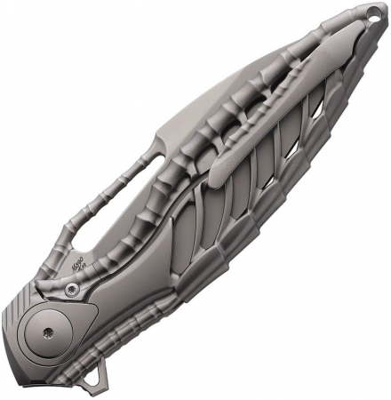 4.75" (12.07cm) closed. 3.38" (8.59cm) bead blast finish Bohler M390 stainless blade. Gray sculpted titanium handle. Extended tang. Thumb pull. Lanyard hole. Pocket clip. Black nylon zippered storage case. Boxed.