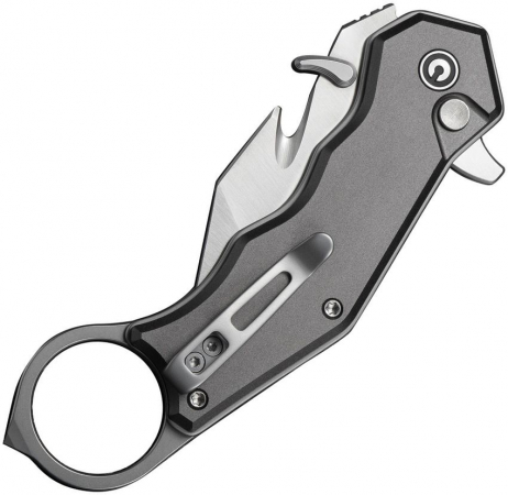 4.63" (11.76cm) closed. 2.13" (5.41cm) satin finish Nitro V steel reverse tanto blade. Gray aluminum handle. Extended tang. Thumb disk. Glass breaker. Finger ring. Pocket clip. Belt/cord cutter. Black nylon zippered storage case. Boxed.