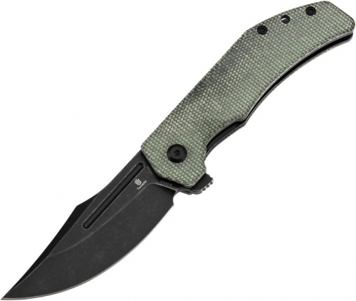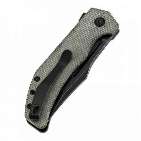 4.13" (10.49cm) closed. 3.13" (7.95cm) black stonewash finish 14C28N Sandvik stainless clip point blade. Green canvas micarta handle. Extended tang. Lanyard hole. Pocket clip.