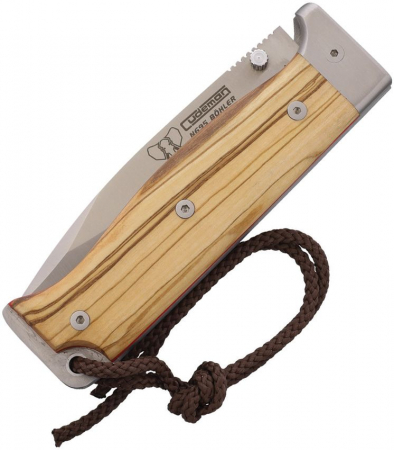 5" (12.7cm) closed. 3.75" (9.53cm) satin finish Bohler N695 stainless drop point blade. Olive wood handle. Lanyard hole. Red liners. Limited edition. Brown leather belt sheath. Boxed.