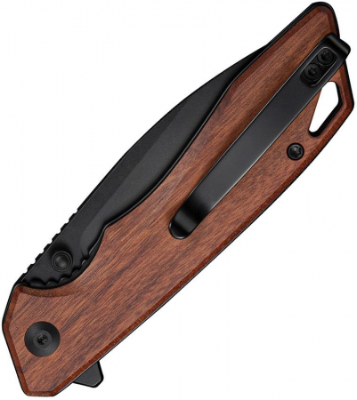 4.38" (11.13cm) closed. 3.25" (8.26cm) black finish 9Cr18MoV stainless drop point blade. Brown wood handle. Thumb stud. Lanyard hole. Pocket clip. Extended tang. Black nylon zippered storage case