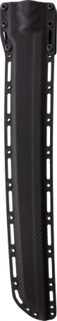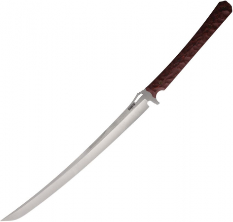 26" (66.04cm) overall. 16" (40.64cm) satin finish CPM MagnaCut stainless blade. Black and red sculpted G10 handle. Full tang. Samurai style blade. Carbon fiber Kydex MOLLE compatible belt sheath. Bulk packed.