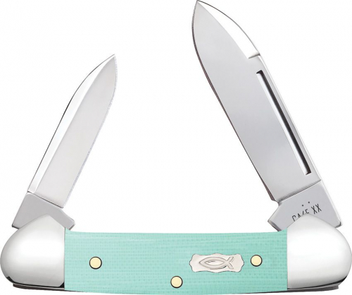 102132 SS pattern. 2.75" (6.99cm) closed. Mirror finish stainless spear and pen blades. Seafoam green G10 handle. Nickel silver bolster(s). Inlay shield. Boxed.