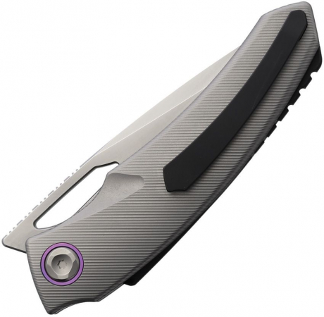 4.38" (11.13cm) closed. 3.38" (8.59cm) Bohler M398 stainless tanto blade. Gray titanium handle. Thumb pull. Pocket clip. Pearlescent stonewash finish blade. Purple accents. Zippered storage case.