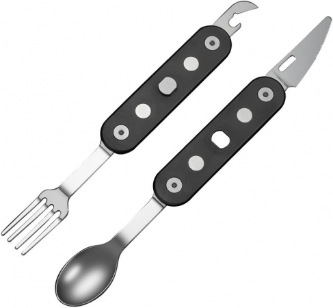 4.38" closed. Black aluminum handle. Stainless knife, fork, spoon, and can opener. Tools nest with magnets. Canvas pouch. Boxed.