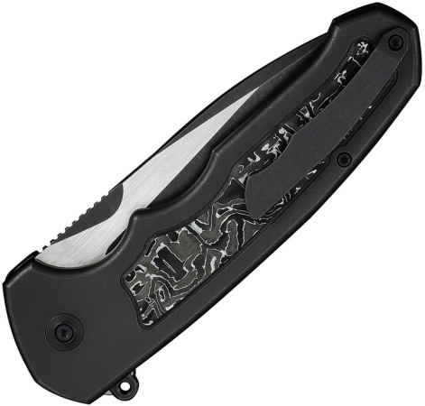 5.38" (13.67cm) closed. 4" (10.16cm) black stonewash and satin finish Bohler M390 stainless drop point blade. Black titanium handle with Aluminum foil carbon fiber inlay. Extended tang. Pocket clip. Black nylon zippered storage case.