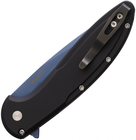 4.5" (11.43cm) closed. 3.5" (8.89cm) blue coated MagnaCut steel blade. Black anodized aluminum handle with Shredded carbon fiber inlay. Extended tang. Pocket clip. Mosaic button. Boxed.