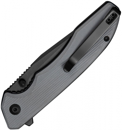 4.63" (11.76cm) closed. 3.38" (8.59cm) black finish D2 tool steel clip point blade. Gray G10 handle. Extended tang. Thumb stud. Pocket clip. Black nylon zippered storage case