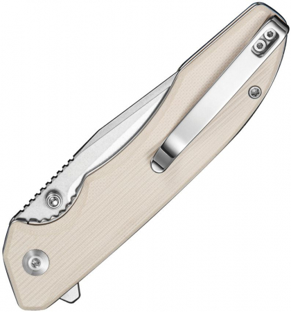 4.63" (11.76cm) closed. 3.38" (8.59cm) stonewash finish D2 tool steel clip point blade. Ivory G10 handle. Extended tang. Thumb stud. Pocket clip. Black nylon zippered storage case. Boxed.