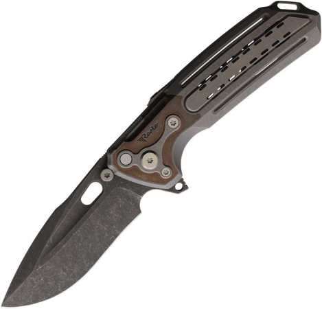 5.25" (13.34cm) closed. 4" (10.16cm) acid washed finish MagnaCut steel blade. Dark stonewash finish titanium handle with copper inlay. Extended tang. Pocket clip. Thumb stud. Serialized. Boxed.