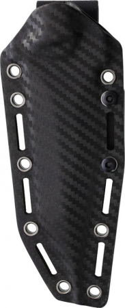 10" (25.4cm) overall. 5.5" (13.97cm) DLC coated double edge CPM-3V carbon steel tanto blade. Carbon fiber handle. Full, extended tang. Finger ring. Blackout GHOST finish blade. Triple hollow Equilibrium Fuller. Recurved ripsaw spine geometry. Micro combat serrated swedge for negative angle cuts and secondary edge engagement. Skeletonized internal frame. Carbon fiber belt sheath. Boxed.