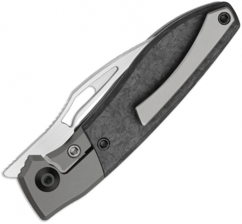 3.63" (9.22cm) closed. 2.75" (6.99cm) brushed finish S45VN stainless drop point blade. Dark gray titanium handle with carbon fiber inlay. Thumb stud. Thumb pull. Pocket clip. Boxed.