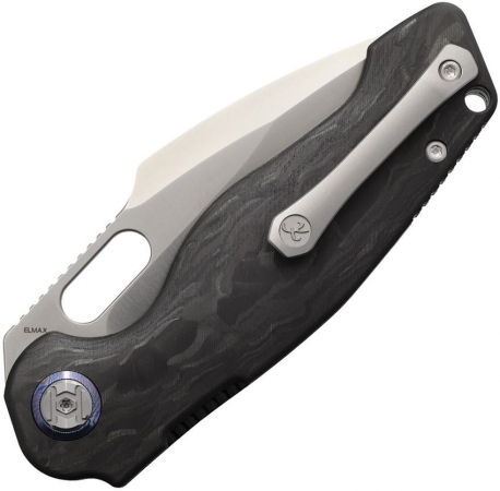 4.75" (12.07cm) closed. 3.63" (9.22cm) satin finish Elmax steel drop point blade. Shredded carbon fiber handle. Lanyard hole. Pocket clip. Thumb pull. Boxed.