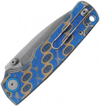 4.13" (10.49cm) closed. 3" (7.62cm) satin finish 14C28N Sandvik stainless drop point blade. Blue Ocean micarta handle. Lanyard hole. Pocket clip. Thumb stud. Black nylon pouch. Boxed.