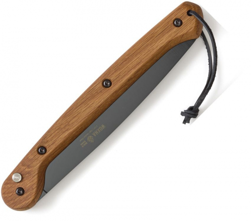 11.75" (29.85cm) closed. 10" (25.4cm) black finish blade. Oak handle. Lanyard hole. High carbon steel blade with 7 TPI and three phase grind.