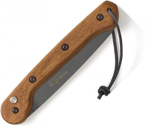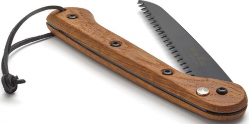 9" (22.86cm) closed. 7" (17.78cm) black finish blade. Oak handle. Lanyard hole. High carbon steel blade with 7 TPI and three phase grind.
