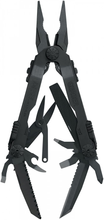 Components: Needlenose pliers, wire cutter, wire crimper, partially serrrated knife blade, cross point screwdriver, small, medium and large flat blade screwdrivers, can opener, bottle opener, file, saw and scissors.
